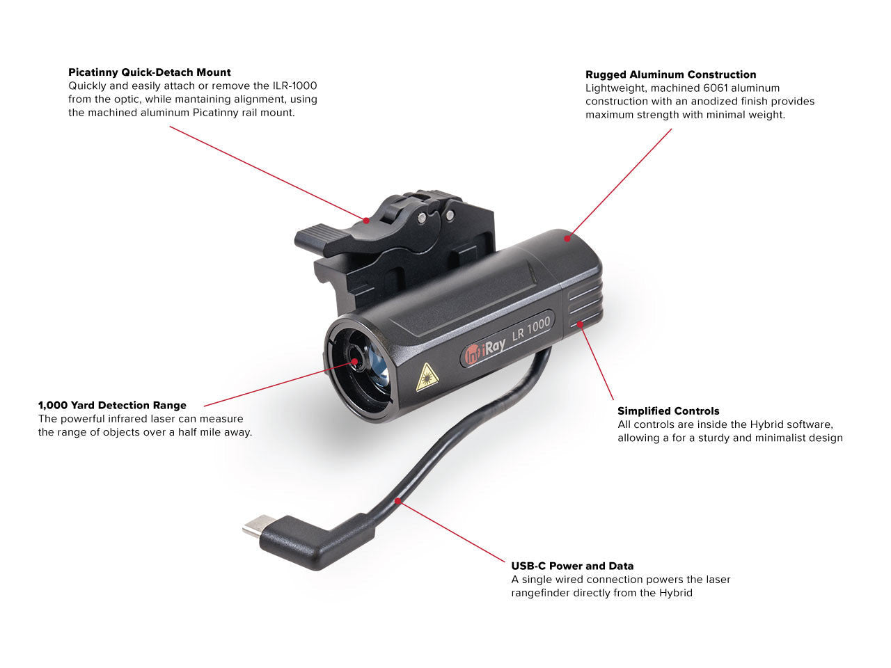 The InfiRay Outdoor ILR-1000-2 Infrared Laser Rangefinding Module enhances precision shooting with thermal optics, seamlessly integrating with HYBRID Series thermal weapon sights via USB-C. Additionally, the ILR-1000-2 InfiRay finder integrates with the HYBRID's onboard ballistic solver by providing real-time range data to display a firing solution on a custom drop-compensating reticle. This eliminates the need for guesswork in range estimation, regardless of the time of day. With a range accuracy of +/- 1 yard out to 1,000 yards, the ILR-1000-2 displays precise results directly on the connected HYBRID Series weapon sight.